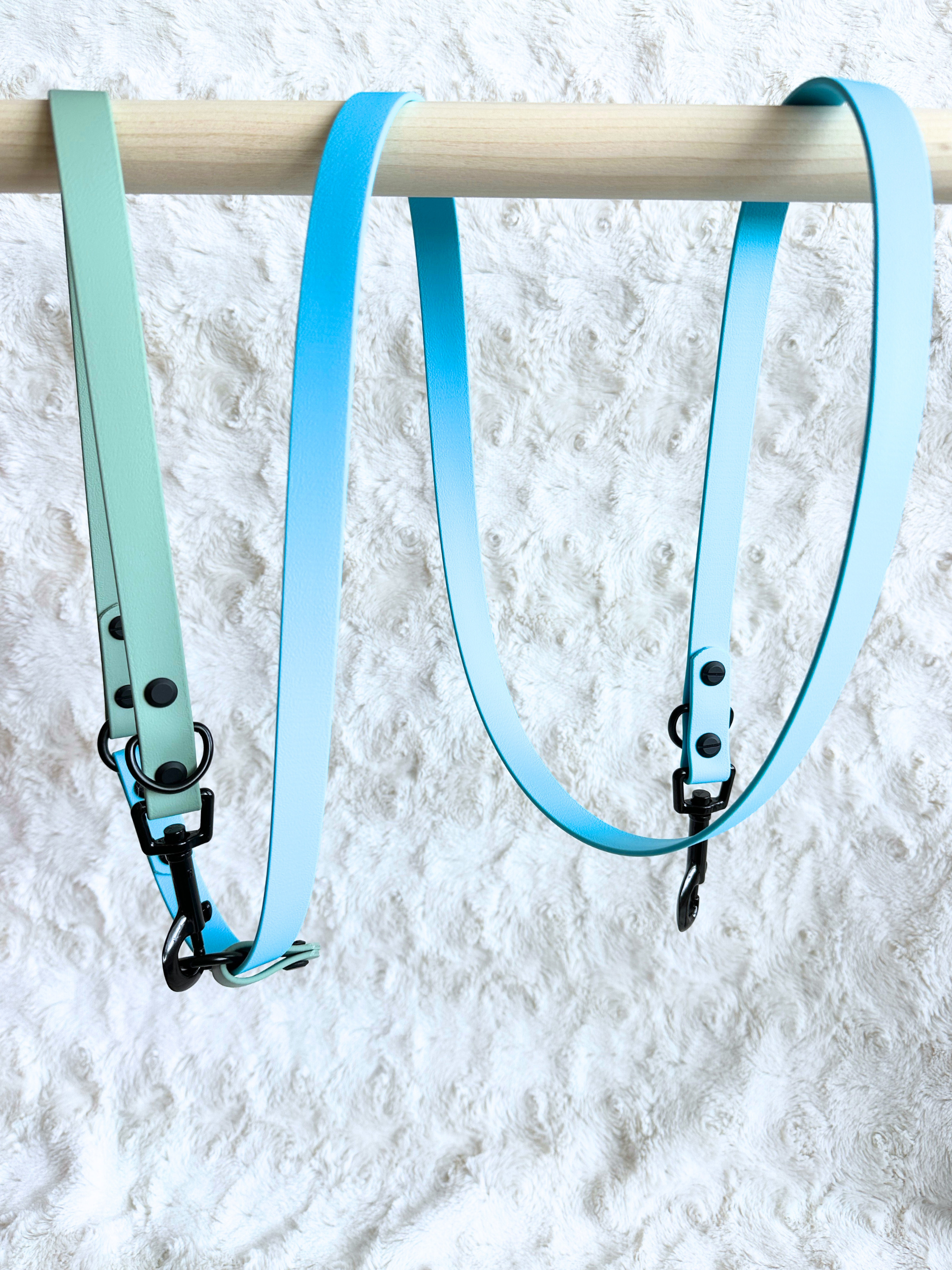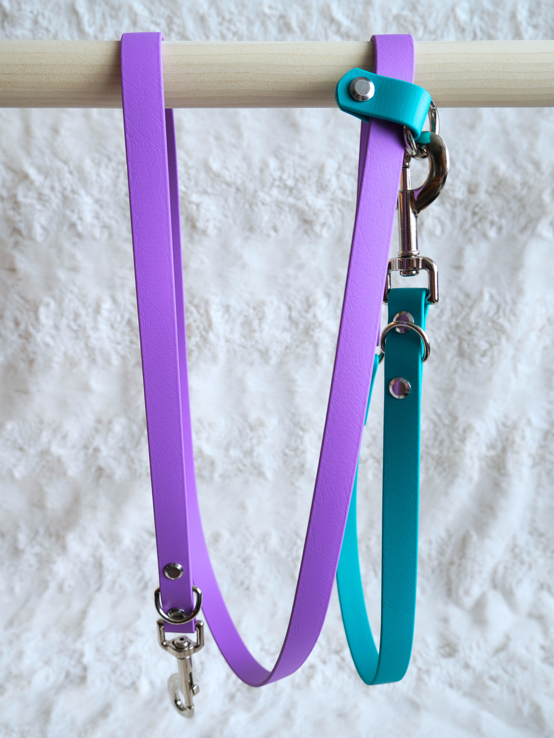 This BioThane® webbed leash is stink-proof and easy to clean! BioThane® webbing has a soft coating that has the look and feel of leather, a matte appearance, and is soft and very flexible. It will also hold its flexibility in very cold weather. Our leashes are made with 3/4" wide standard Beta Biothane® webbing, which has a 750 lb. break strength. We use Chicago-style screws and hardware glue to fasten the BioThane® webbing together to ensure maximum safety for our furry friends. We also feature additional attachment points for backup leashes (purchased separately) for additional safety.