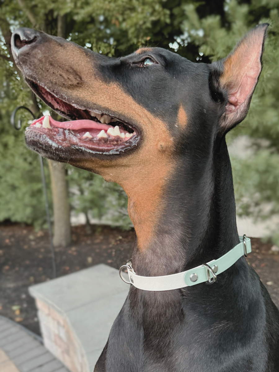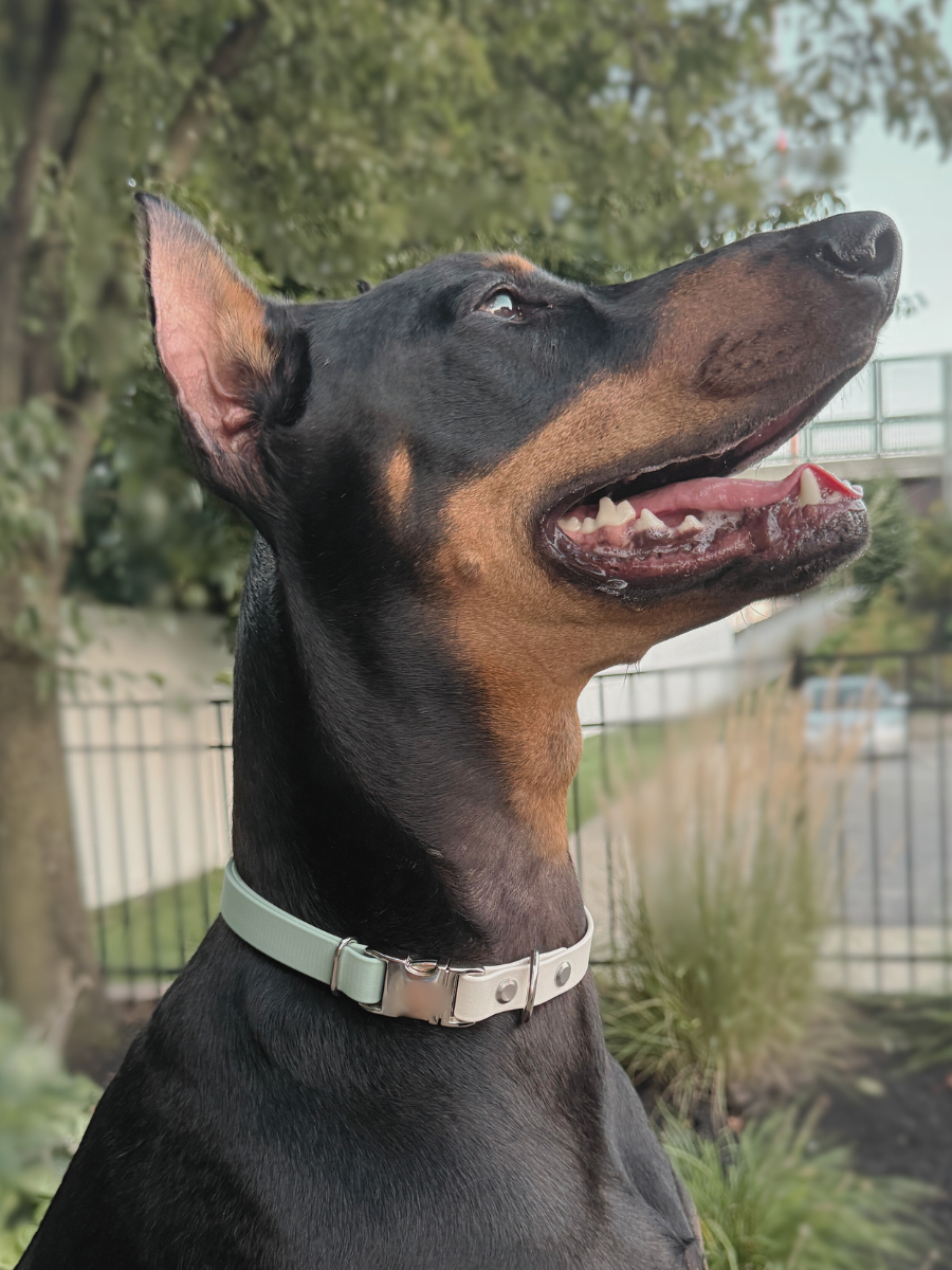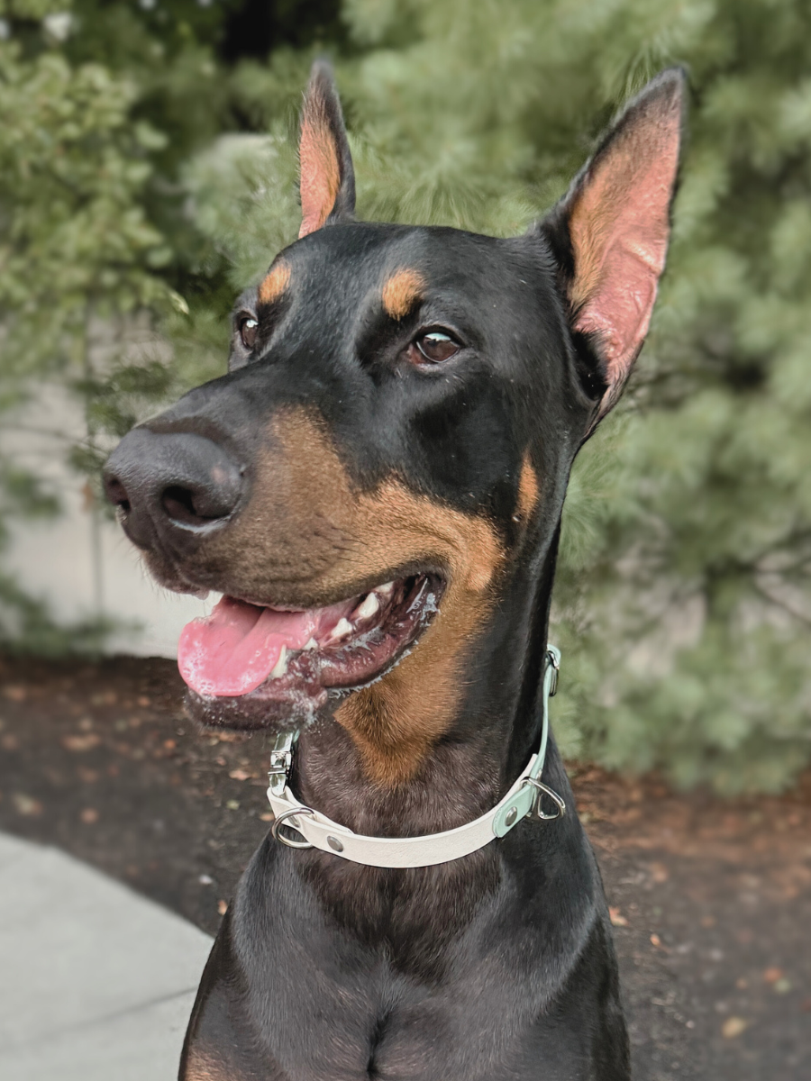 The collars pictured features: 1-3) Forest Green as the primary color and Caramel as the secondary color with silver hardware, 4) Collar 1: Forest Green/Caramel, Collar 2: Blueberry/Cerulean, Collar 3: Black/Brown, 5-7) Doberman wearing a Large size collar, White/Sage with silver hardware.